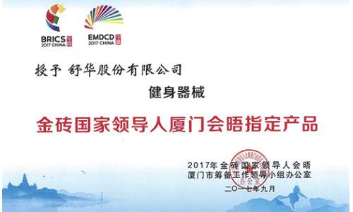 2017年,球王会体育健身器材入驻厦门金砖国家领导人会晤,并成为厦门金砖会晤指定健身器械。X6豪华智能家用跑步机荣获中国好设计金奖。 2017, Shuhua fitenss equipment presented itself in Xiamen as the designated fitness equipmentof Xiamen BRICS summit. X6 luxurious home use treadmill won gold award of China Good Design.